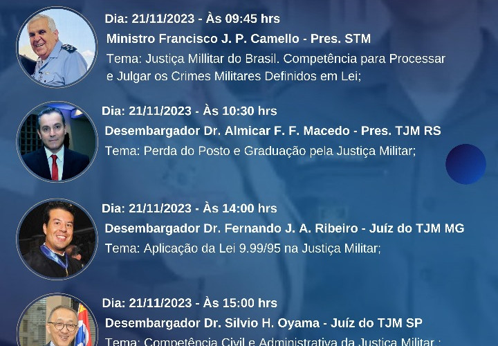 Temas referentes a Justiça Militar no Brasil serão debatidos e palestrados por nomes renomados como o ministro Francisco Camello, presidente do Superior Tribunal Militar e os desembargadores Almicar Macedo, Fernando Ribeiro e Sílvio Oyama, respectivamente, presidente do Tribunal de Justiça Militar do Rio Grande do Sul e juízes dos Tribunais de Justiça Militar de Minas Gerais e São Paulo.
